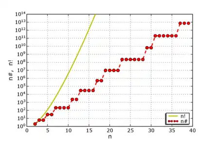 Voici les premières valeurs des primorielles, en prenant par convention 0# = 1, sous forme de liste[1] et de représentation graphique. La liste ne donne que pour premier puisque, par définition, la suite est constante entre deux premiers consécutifs.