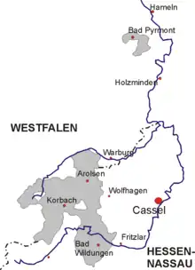 - la principauté de Waldeck proprement dite, enclavée dans l'ancien électorat de Hesse et dans les districts de Minden et d'Arensberg de la province de Westphalie,