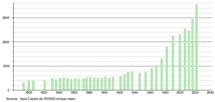 - Population municipale légale en vigueur au 1er janvier 2024, millésimée 2021, définie dans les limites territoriales en vigueur au 1er janvier 2023, date de référence statistique : 1er janvier 2021.