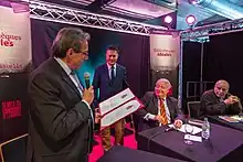 Roland Ries, sénateur-maire de Strasbourg remet le Goncourt de la nouvelle à Fouad Laroui, en présence d’Antoine Spire et Tahar Ben Jelloun lors des « Bibliothèques idéales » le 21 septembre 2013.