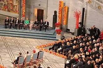 La cérémonie de remise du prix s'est tenue le en présence du roi de Norvège Harald V et de la famille royale, des présidents de la Commission européenne (José Manuel Durão Barroso), du Conseil européen (Herman Van Rompuy) et du Parlement européen (Martin Schulz) et d'une vingtaine de chefs d'État et de gouvernement européens[3],[4].