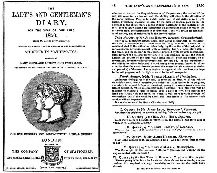 - « Query VI », The Lady’s and Gentleman’s Diary for the year 1850, , p. 48.