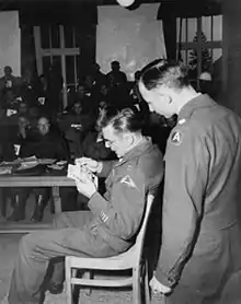 Le prêtre polonais Theodore Korcz (à gauche) assisté du procureur en chef Denson fait la lecture du protocole des expériences sur le paludisme le