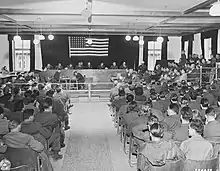 La création d'un tribunal de guerre pour y conduire le procès de Dachau fut décrétée le par le quartier général de l'armée de terre des États-Unis et débutée le . Le général de division John M. Lentz prit la direction du tribunal militaire ; comme les sept juges siégeant à ses côtés, il portait un uniforme durant l'audience. L'accusation, sous le commandement du procureur en chef William D. Denson, était composée de quatre officiers américains. La défense des accusés fut assurée par cinq officiers américains et par le conseiller juridique (de) allemand Hans von Posern. Le procès se déroulant en anglais, des interprètes étaient chargés d'assurer la communication en anglais et en allemand entre la cour et les accusés. Des observateurs du procès issus de pays alliés devaient prendre part à l'audience[10].