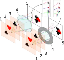 - Le sténopé est un appareil très rudimentaire dépourvu d'objectif. Un petit trou est situé face à la surface sensible. Si ce trou est trop gros, l'image est floue ; s'il est trop petit, le temps de pose devient prohibitif et la diffraction produit de gros dégâts. L'image donnée par un sténopé n'est jamais vraiment nette, de sorte que la notion de profondeur de champ ne s'applique pas vraiment, ou alors avec une tolérance angulaire énorme par rapport aux usages classiques. En revanche, le flou de l'image est homogène et donne alors l'impression, tant qu'il reste raisonnable, d'une profondeur de champ infinie.