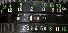 Si l'objectif dispose d'une échelle de profondeur de champ, comme illustré ci-dessus, le photographe peut s'en servir pour prévoir la profondeur de champ : de part et d'autre du repère qui indique la distance de mise au point (réglée entre 1 et 2 m sur l'illustration), des gravures symétriques portant des valeurs de diaphragme, 11, 16 et 22, indiquent les limites de la profondeur de champ. Pour une ouverture réglée sur f/11, comme l'indique la bague de réglage de l’ouverture, le premier plan net sera situé à 1 m et le dernier plan net à 2 m. Il est intéressant d'observer ensuite l'augmentation de la profondeur de champ lorsque l'ouverture diminue, jusqu'à f/22 pour cet objectif.