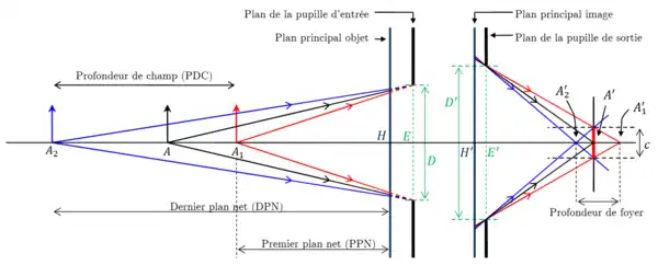 - est la distance algébrique à laquelle se situe le premier plan net (PPN) du plan principal objet ; est l'intersection de ce plan avec l'axe optique.
