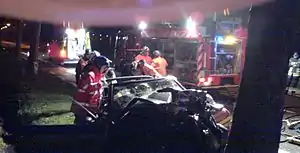 - un véhicule de secours à personne (VSAB ou VSAV) avec trois personnes ; il se gare juste après l'accident (dans le sens de circulation de la voie) ;