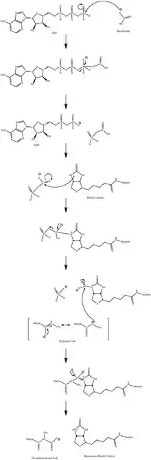 Mécanisme réactionnel proposé pour la propionyl-CoA carboxylase.