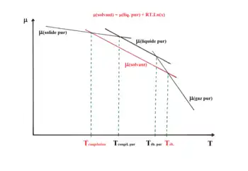 Lorsque l'on introduit une quantité très petite de soluté dans le solvant liquide, la solution obtenue peut être considérée comme idéale. Le potentiel chimique du solvant en phase liquide est alors modifié selon :