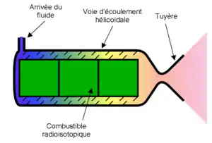 Le concept est un développement du générateur thermoélectrique à radioisotope (RTG), qui produit de l'électricité à partir de la chaleur radioactive. Pour la propulsion, le système de conversion électrique est remplacé par un échangeur dans lequel circule le fluide à chauffer. Les températures atteignables vont de 1 500 à 2 000 °C, permettant une impulsion spécifique de 700 à 800 s, environ le double des performances du meilleur système de propulsion chimique (LOX/LH2).