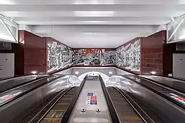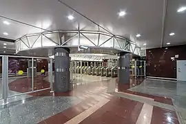 La station dispose, en surface, de quatre bouches couvertes, deux au nord desservent le hall souterrain nord et deux au sud desservent le hall souterrain sud. Chacun des halls est relié au quai par un tunnel en pente équipé d'escaliers mécaniques[2].