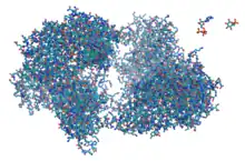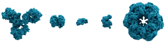 Surface moléculaire de plusieurs protéines représentées à l'échelle. De gauche à droite : immunoglobuline G (un anticorps, PDB 1IGY[13]), hémoglobine (PDB 2DHB[14]), insuline (une hormone, PDB 4INS[15]), adénylate kinase (une enzyme, PDB 1ZIN[16]) et glutamine synthétase (PDB 1FPY[17]).