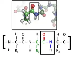 Liaison peptidique –CO–NH– au sein d'un polypeptide. Le motif –NH–CαHRn–CO– constitue le squelette de la protéine, tandis que les groupes –Rn liés aux carbones α sont les chaînes latérales des résidus d'acides aminés.