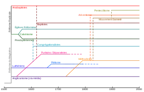 En Angleterre, les convenances personnelles du roi Henri VIII en matière matrimoniale le conduisent à rompre avec Rome. Née de ce schisme, l'Église anglicane conserve d'abord tous les aspects extérieurs du catholicisme mais évoluera graduellement vers le protestantisme tandis que le catholicisme poursuit son évolution divergente par le biais des doctrines promulguées après la rupture[24]. En Suisse, les cantons s'étaient déterminés séparément, les plus vastes et les plus puissants (Bâle, Zurich, Berne) basculant vers le protestantisme[24]. En Europe du Sud, les velléités du luthéranisme avaient été éteintes par l'Inquisition. Seule exception notable, la communauté hérétique dite vaudoise : lors du synode de Chanforan, la majeure partie de l'Église vaudoise choisit d'adhérer à la Réforme en 1532. Malgré les persécutions (entre autres le massacre de trois mille Vaudois du Luberon en 1545), cette petite communauté s'est maintenue dans le Piémont[24]. Le protestantisme connaît ensuite une expansion mondiale au travers des mouvements missionnaires qui, le plus souvent, accompagnent la colonisation. Dans le cas des États-Unis, il est alimenté en outre par l'exil des non-conformistes religieux d'Angleterre ou d'autres régions d'Europe : ainsi les quakers puis les non-conformistes anglicans (puritains) sont-ils très tôt et très largement implantés dans le Nouveau Monde, mais c'est le cas aussi des anabaptistes germaniques (allemands, suisses, alsaciens) qui fondent les communautés mennonites et amish aux États-Unis[24].
