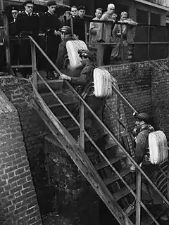Le manque de main-d'œuvre belge a pour conséquence d'entraîner une chute de la production de charbon. Cette chute de production conduit à débuter des négociations en 1945 avec l’Italie qui aboutiront à un accord en 1946. « Dans des circonstances où toute l’Europe manque de charbon, l’Italie se ménageait une assurance d’approvisionnement »[17]. En effet, le gouvernement belge promet à l’Italie un approvisionnement (payant) de deux à trois tonnes de charbon par an contre 50 000 ouvriers italiens[18]. Une propagande du travail de mineur est organisée. Des établissements de recrutement sont créés (notamment à Milan).