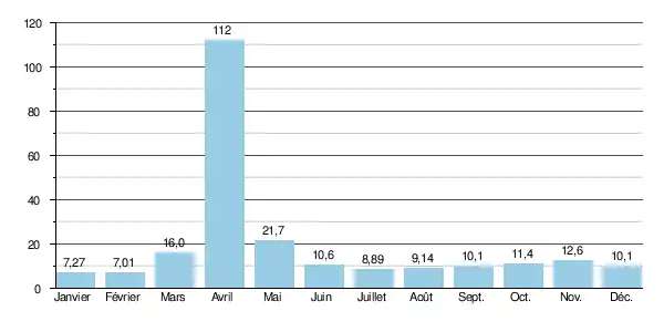 Le débit moyen mensuel observé à l'étiage de février se monte à 7,01 m3/s, soit plus ou moins 6 % du débit moyen du mois d'avril (maximum de l'année), ce qui souligne l'amplitude assez élevée des variations saisonnières. Sur la période d'observation de 47 ans, le débit mensuel minimal a été de 3,43 m3/s en - ce qui reste appréciable -, tandis que le débit mensuel maximal s'est élevé à 223 m3/s en .