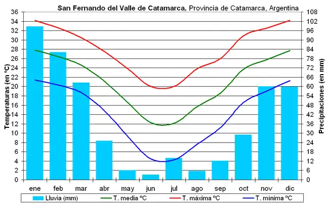 Le climat très continental de la ville de Catamarca est chaud et sec, quoiqu'il y tombe annuellement quelque 458 mm de pluie. Mais celles-ci sont très irrégulières et insuffisantes pour une température moyenne annuelle de 21 °C.