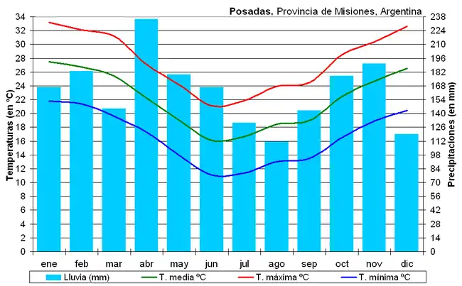 Au pied des chutes d'Iguazú, à Puerto Iguazú dans le nord de la province, les données climatiques se présentent comme suit :