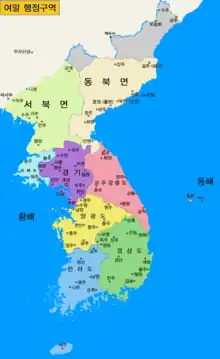 En 1413, la Corée (à l'époque appelée Joseon) était divisée en huit provinces : Chungcheong, Gangwon, Gyeonggi, Gyeongsang, Jeolla, Hamgyong (à l'origine appelé Yeonggil), Hwanghae (à l'origine appelé Punghae), et Pyongan.