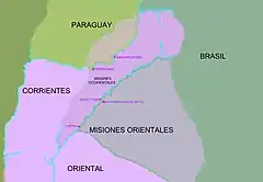 - l’intendance des Missions guaranis, qui fut réduite ensuite à une comandancia de armas et qui comprenait les départements de Yapeyú, de Candelaria et de Concepción. Le département de Santiago fut intégré dans le Paraguay en 1805, tandis que celui de San Miguel et une partie de ceux de Yapeyú et de Concepción se trouvaient alors sous occupation portugaise.