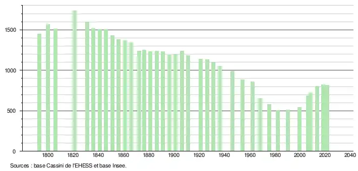 L'évolution du nombre d'habitants est connue à travers les recensements de la population effectués dans la commune depuis 1793. Pour les communes de moins de 10 000 habitants, une enquête de recensement portant sur toute la population est réalisée tous les cinq ans, les populations légales des années intermédiaires étant quant à elles estimées par interpolation ou extrapolation[16]. Pour la commune, le premier recensement exhaustif entrant dans le cadre du nouveau dispositif a été réalisé en 2008[17].