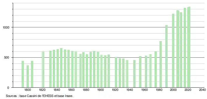 L'évolution du nombre d'habitants est connue à travers les recensements de la population effectués dans la commune depuis 1793. Pour les communes de moins de 10 000 habitants, une enquête de recensement portant sur toute la population est réalisée tous les cinq ans, les populations légales des années intermédiaires étant quant à elles estimées par interpolation ou extrapolation[20]. Pour la commune, le premier recensement exhaustif entrant dans le cadre du nouveau dispositif a été réalisé en 2005[21].