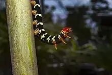 La chenille est de grande taille, à rayures de couleur jaune et noire et à tête rouge-orange. Sur l'arrière du corps, elle possède un filament qui oscille dans un mouvement de va-et-vient lors de sa marche.