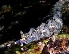 Le corps est couvert de cérates relativement courts, étroits et répartis symétriquement le long du corps en touffes doubles afin d'optimiser le processus de photosynthèse de ses hôtes internes. Ceux-ci peuvent être allongés et comme échevelés, ou recourbés vers l'arrière.