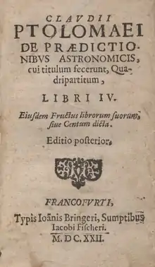 Le traité de Ptolémée sur l’astrologie, le Tetrabiblos (tetra signifie en grec « quatre » et biblos « livre »), était l’ouvrage astrologique le plus célèbre de l’Antiquité. Il exerça une grande influence dans l’étude des corps célestes dans la sphère sublunaire. Ainsi, il fournissait des explications des effets astrologiques des planètes, en fonction de leurs aspects[21] : effet chauffant, rafraîchissant, mouillant, et séchant. Celui-ci traite en particulier de l’astrologie individuelle en quatre livres qui consiste en une interprétation thématique à l’aide de l’érection d’une carte basée sur un tableau déterminant l’emplacement des sept planètes (Soleil compris) connues à l’époque à un moment donné.