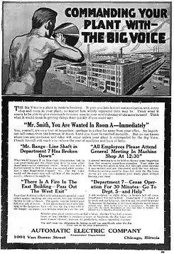 En , l'Automatic Electric Company (en) de Chicago, dans l'Illinois, qui était déjà un important fournisseur de standards téléphoniques automatiques, annonça qu'elle avait mis au point un haut-parleur, qu'elle commercialisa sous le nom d’Automatic Enunciator (ou annonceur automatique). Le président de la société, Joseph Harris, prévoyait de multiples utilisations potentielles, et la publicité initiale soulignait la valeur de l'invention en tant que système de sonorisation d'hôtel, permettant aux personnes dans toutes les pièces publiques d'entendre les annonces vocales[2]. En juin 1910, une première démonstration "semi-publique" est faite aux journalistes de la presse dans le bâtiment de l'Automatic Electric Company, où la voix d'un orateur est transmise à des haut-parleurs placés à une douzaine d'endroits « dans tout le bâtiment »[3].