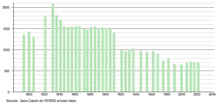 L'évolution du nombre d'habitants est connue à travers les recensements de la population effectués dans la commune depuis 1793. Pour les communes de moins de 10 000 habitants, une enquête de recensement portant sur toute la population est réalisée tous les cinq ans, les populations légales des années intermédiaires étant quant à elles estimées par interpolation ou extrapolation[25]. Pour la commune, le premier recensement exhaustif entrant dans le cadre du nouveau dispositif a été réalisé en 2006[26].