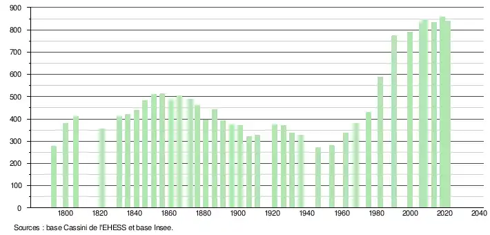 L'évolution du nombre d'habitants est connue à travers les recensements de la population effectués dans la commune depuis 1793. Pour les communes de moins de 10 000 habitants, une enquête de recensement portant sur toute la population est réalisée tous les cinq ans, les populations légales des années intermédiaires étant quant à elles estimées par interpolation ou extrapolation[27]. Pour la commune, le premier recensement exhaustif entrant dans le cadre du nouveau dispositif a été réalisé en 2008[28].