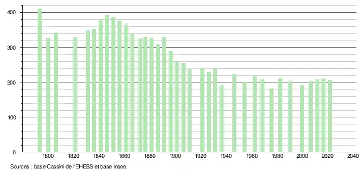L'évolution du nombre d'habitants est connue à travers les recensements de la population effectués dans la commune depuis 1793. Pour les communes de moins de 10 000 habitants, une enquête de recensement portant sur toute la population est réalisée tous les cinq ans, les populations légales des années intermédiaires étant quant à elles estimées par interpolation ou extrapolation[15]. Pour la commune, le premier recensement exhaustif entrant dans le cadre du nouveau dispositif a été réalisé en 2006[16].