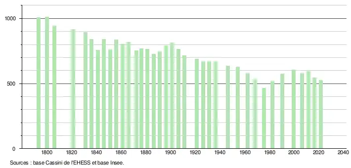 L'évolution du nombre d'habitants est connue à travers les recensements de la population effectués dans la commune depuis 1793. Pour les communes de moins de 10 000 habitants, une enquête de recensement portant sur toute la population est réalisée tous les cinq ans, les populations légales des années intermédiaires étant quant à elles estimées par interpolation ou extrapolation[28]. Pour la commune, le premier recensement exhaustif entrant dans le cadre du nouveau dispositif a été réalisé en 2006[29].
