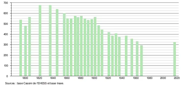 L'évolution du nombre d'habitants est connue à travers les recensements de la population effectués dans la commune depuis 1793. Pour les communes de moins de 10 000 habitants, une enquête de recensement portant sur toute la population est réalisée tous les cinq ans, les populations légales des années intermédiaires étant quant à elles estimées par interpolation ou extrapolation[4]. Pour la commune, le premier recensement exhaustif entrant dans le cadre du nouveau dispositif a été réalisé en 2007[5].