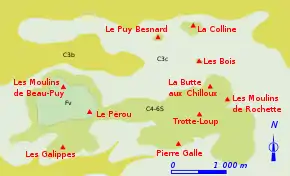 Des moulins à vent de type moulin cavier ont été construits au sommet de certains de ces puys  il en a été recensé 28 au XIXe siècle[D 8]  et, même si beaucoup ont disparu ou sont ruinés (puy de la Colline, puy Besnard), d'autres sont encore partiellement debout et leur souvenir persiste grâce à la toponymie : moulins de Rochette ou de Beau-Puy[D 8].