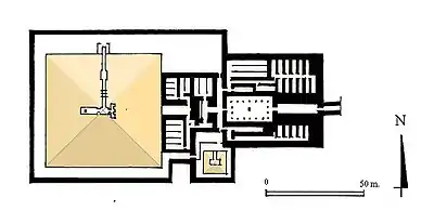 La pyramide dominait l'ensemble avec son revêtement en calcaire fin dont une partie est visible au sud du monument. La base mesure 57,7 m et la hauteur est de 43 m.