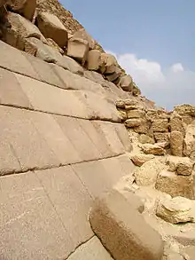 La pyramide proprement dite est constituée de gros blocs taillés dans un calcaire local extrait des carrières environnantes. Ajustés en assises régulières, ils forment des gradins sur lesquels prennent appui les blocs du parement.