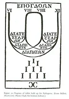 Pythagore a découvert les lois de l'harmonique[114]. Aristote : « Ces philosophes remarquèrent que tous les modes de l'harmonie musicale et les rapports qui la composent se résolvent dans des nombres proportionnels[115]. » La proportion harmonique gouverne les intervalles musicaux. Dans la proportion harmonique 12, 8 et 6, le rapport 12/6 = 2 correspond à l'octave, le rapport 8/6 = 4/3 correspond à la quarte, le rapport 12/8 = 3/2 correspond à la quinte. L'accord pythagoricien est un système musical construit sur des intervalles de quintes justes, dont le rapport de fréquences vaut 3/2. Les fréquences pythagoriciennes de la note Do sont celles des puissances de deux. Le rapport 9/8 donne également l'epogdoon, c'est-à-dire la seconde majeure ou le ton.