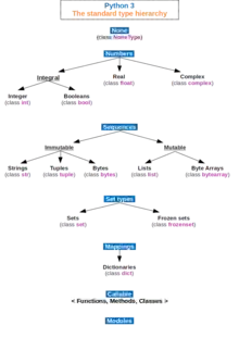 Noneest simplement le type d'un « vide ». Il sert à dénoter qu'une variable est vide.typeest le type du type des objets, obtenu grâce à la méthodetype().objectest le type basique dont tous les autres types « héritent »sliceest une partie de type ou un objet extensibleNotImplementedTypeest, comme son nom l'indique, une absence d'implémentation du type auquel on essaie d'accéder.boolest un booléen, soit le type deTrueetFalserenvoyés par exemple lors de comparaisons hors de l'utilisation de méthodesis_x().exceptionest le type d'un message d'erreur lancé lorsque le code lève une exception.functionest le type d'une fonction, utilisé lors de l'appel des mots-clefdefetlambda.moduleest le type d'un module, utilisé lors de l'appel des mots-clefimportetfrom.