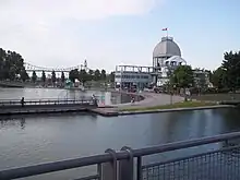 À l'ouest se trouvent les écluses à l’entrée du Canal de Lachine et en face le Quai de la Pointe du Moulin et ses silos.