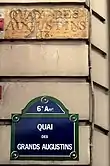 L'ancien nom gravé, « quay des Augustins », et la plaque actuelle.