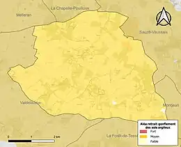 Les mouvements de terrains susceptibles de se produire sur la commune sont des tassements différentiels[16]. Le retrait-gonflement des sols argileux est susceptible d'engendrer des dommages importants aux bâtiments en cas d’alternance de périodes de sécheresse et de pluie[17]. 99,8 % de la superficie communale est en aléa moyen ou fort (54,9 % au niveau départemental et 48,5 % au niveau national)[Carte 2]. Depuis le , en application de la loi ELAN, différentes contraintes s'imposent aux vendeurs, maîtres d'ouvrages ou constructeurs de biens situés dans une zone classée en aléa moyen ou fort[Note 2],[18].