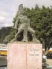 Il semblerait que l'empereur aztèque Moctezuma II ait averti les K'iche et les Kaqchikel de l'arrivée des Espagnols[4]. Après la conquête de Tenochtitlan par Cortés, les Kaqchiqel envoyèrent une ambassade au conquistador et lui offrirent leur soumission, dans l'espoir que les Espagnols les aideraient contre les K'iche'. En 1523, Cortés envoya un de ses capitaines, Pedro de Alvarado, au Guatemala à la tête d'un contingent espagnol accompagné d'alliés mexicains. La confrontation décisive eut lieu le , lors de la bataille de Xelaju (Quetzaltenango), où les K'iche' furent écrasés. Un de leurs chefs, Tecún Umán, tué par de Alvarado lors de cette bataille, est resté un héros populaire et une figure de légende au niveau national. Les K'iche' demandèrent la paix et invitèrent les Espagnols à pénétrer dans Utatlán. Soupçonnant un piège, Alvarado, réputé pour sa cruauté, fit brûler vifs les souverains k'iche et incendier leur capitale.