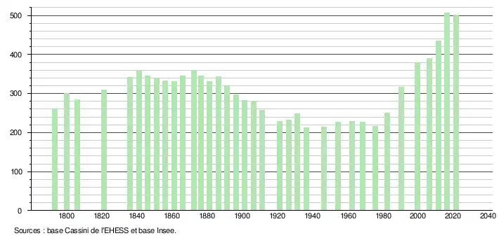 L'évolution du nombre d'habitants est connue à travers les recensements de la population effectués dans la commune depuis 1793. Pour les communes de moins de 10 000 habitants, une enquête de recensement portant sur toute la population est réalisée tous les cinq ans, les populations légales des années intermédiaires étant quant à elles estimées par interpolation ou extrapolation[13]. Pour la commune, le premier recensement exhaustif entrant dans le cadre du nouveau dispositif a été réalisé en 2006[14].
