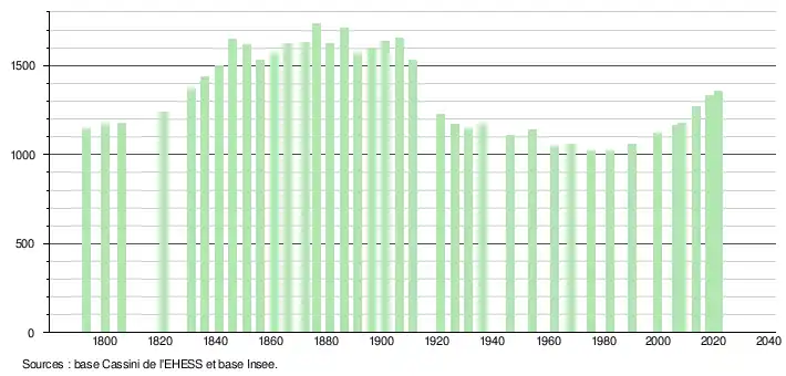 L'évolution du nombre d'habitants est connue à travers les recensements de la population effectués dans la commune depuis 1793. Pour les communes de moins de 10 000 habitants, une enquête de recensement portant sur toute la population est réalisée tous les cinq ans, les populations légales des années intermédiaires étant quant à elles estimées par interpolation ou extrapolation[14]. Pour la commune, le premier recensement exhaustif entrant dans le cadre du nouveau dispositif a été réalisé en 2008[15].
