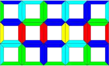 Exemple d'assemblage de quelques tuiles du jeu ci-dessus, respectant la contrainte que deux bords adjacents doivent être de la même couleur.
