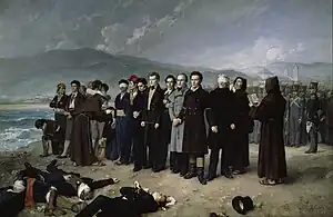 Durant le printemps 1822, les actions des partidas realistas augmentèrent considérablement, surtout en Catalogne, en Navarre, en Galice, en Aragon et au Pays valencien[132] et il y eut plusieurs amorces de rébellions absolutistes, la plus importante ayant eu lieu à Valence le , étouffée le jour suivant — le le général Elío, qui avait déjà été l’auteur du pronunciamiento ayant restauré l’absolutisme en 1814, fut exécuté par garrot d’étranglement après avoir soulevé les artilleurs de la citadelle de Valence (es) —[133],[65],[134]