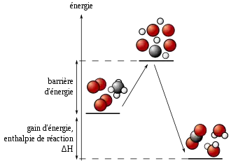 Au cours de la réaction, il y a un stade où les anciennes liaisons sont rompues et les nouvelles ne sont pas encore créées. C'est un état où l'énergie du système est élevée, un état transitoire qui constitue une véritable barrière à la réaction. L'amorçage de la réaction consiste tout simplement à faire franchir cette barrière énergétique, appelée énergie d'activation.